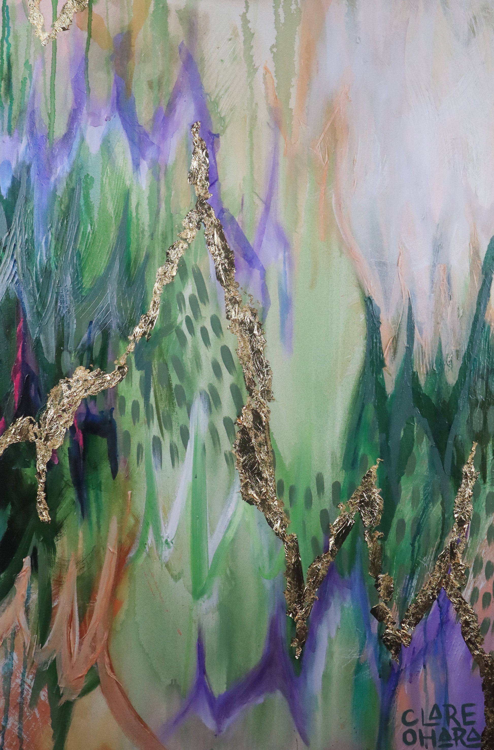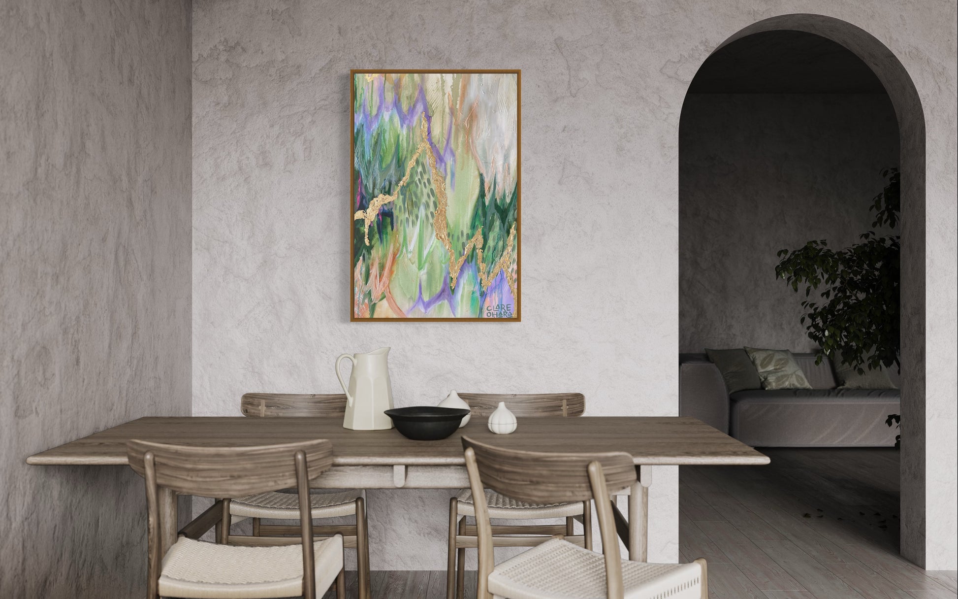 Painted on canvas with acrylic paint, impasto, and translucent mediums with metallic accents. Shadowbox framed in natural oak wood.