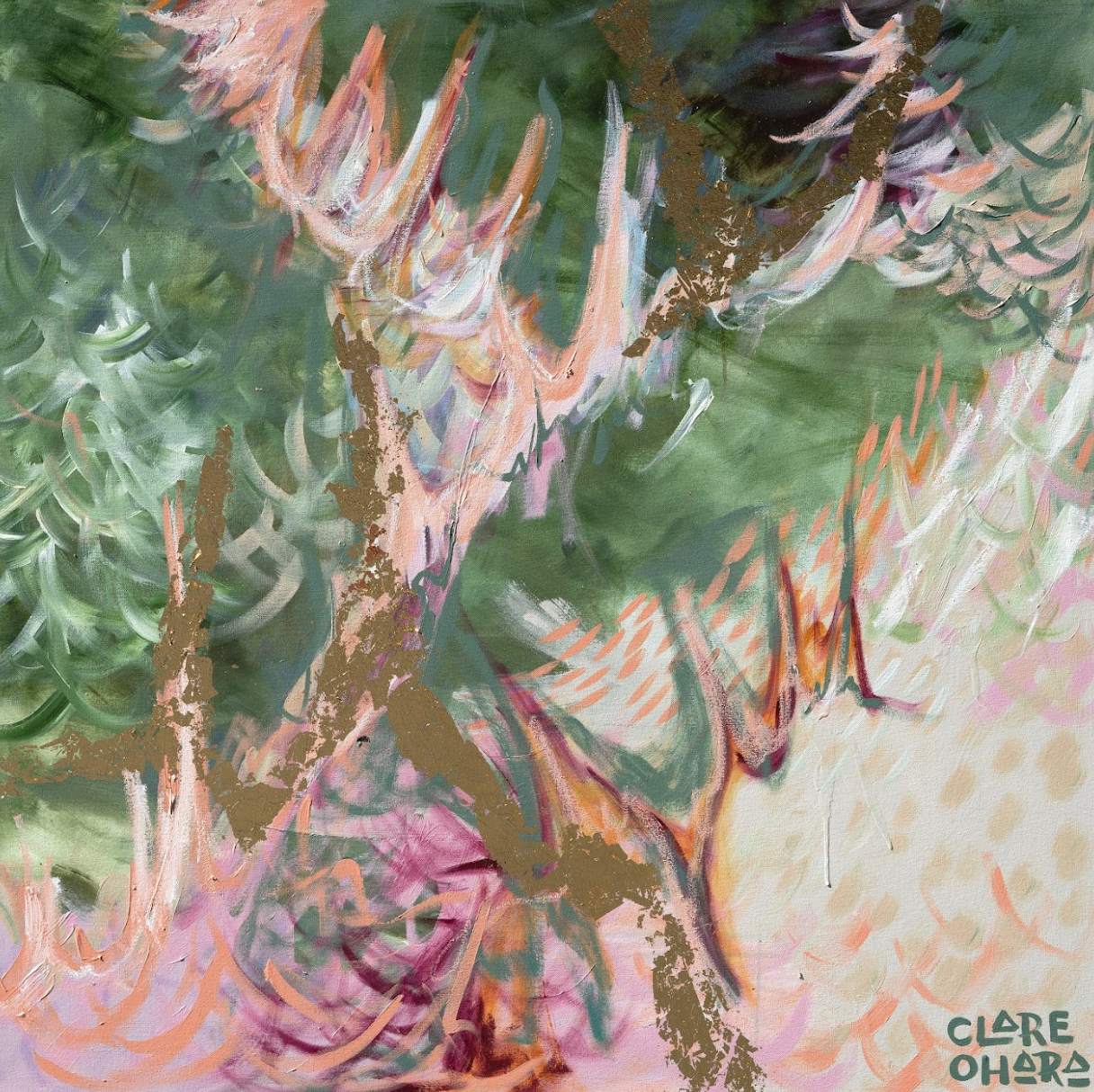 This particular painting was inspired colourways from sunsets in Glenrock State Conservation Area, a beautiful place local to me. It’s a very lush bushland which leads to the ocean. Sunset is a special time there as you have the deep greens of the bush mixing with the fairy floss skies over the ocean.