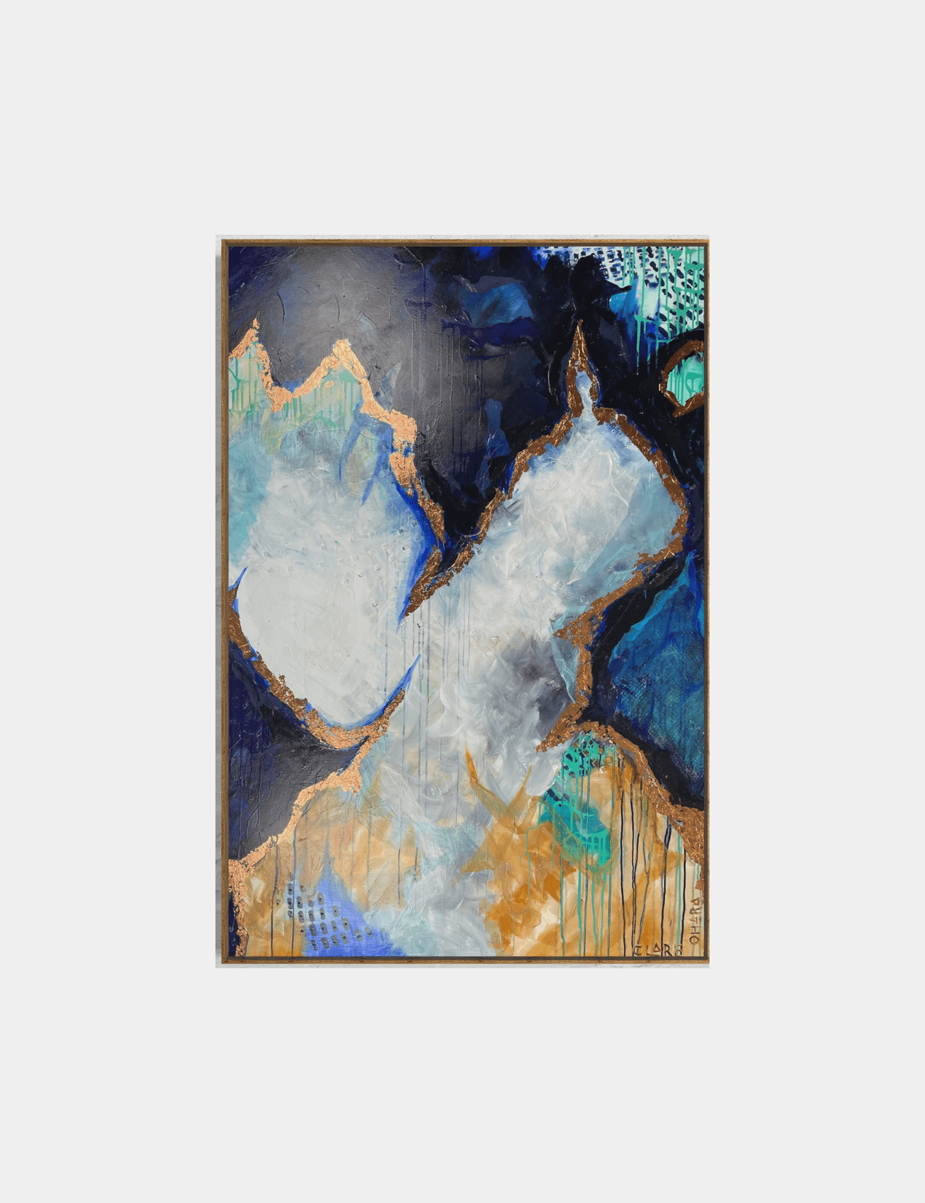 Amazing to think how much I have grown as an artist as I really didn’t like the old artworks anymore. So rather than completely painting over them I left about 5% of the old artworks which you can see some dots and markings through the many layers. I added many more layers of texture, decoupage tinted transparency and added gold foiling. Ta Da…