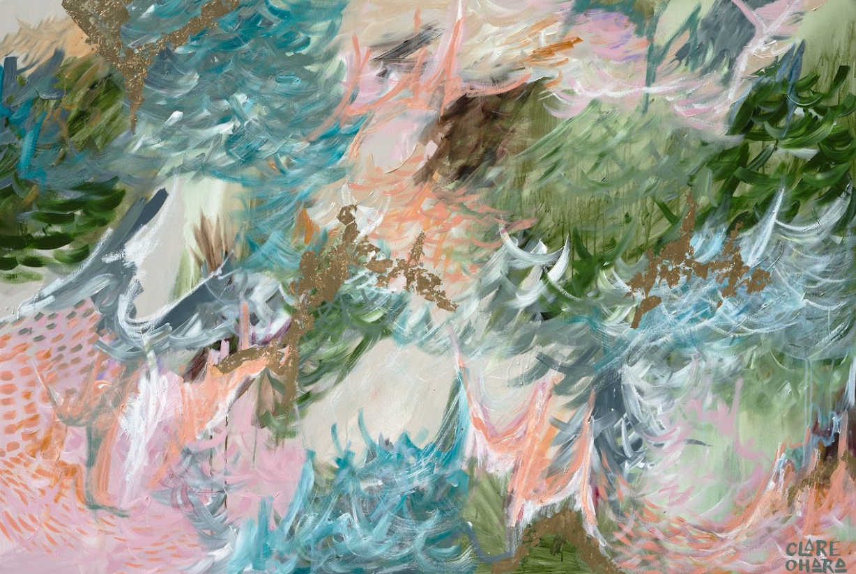 Painted on canvas with acrylic paint, impasto mediums with metallic accents. Glazed and shadowbox framed in natural oak wood.