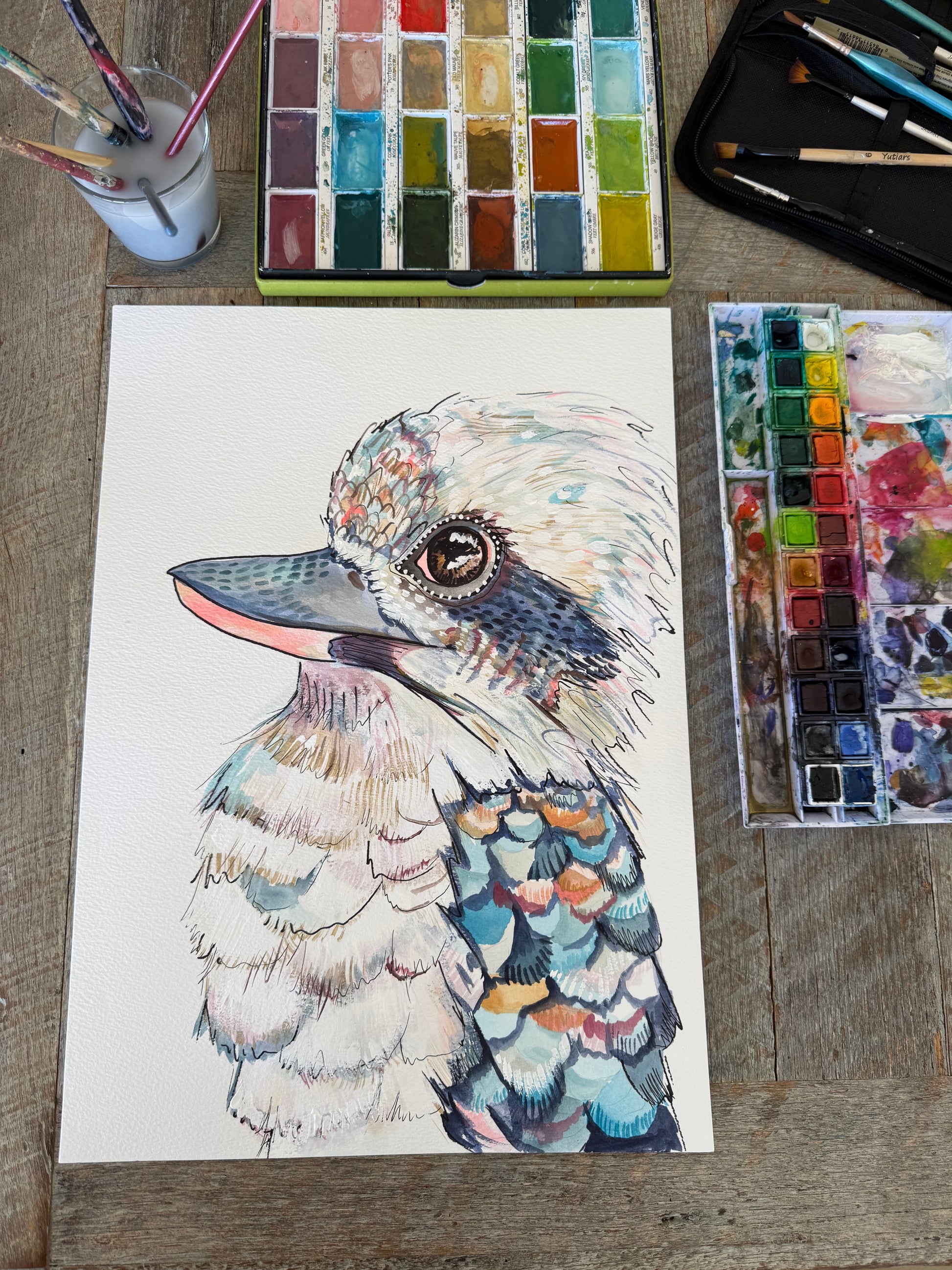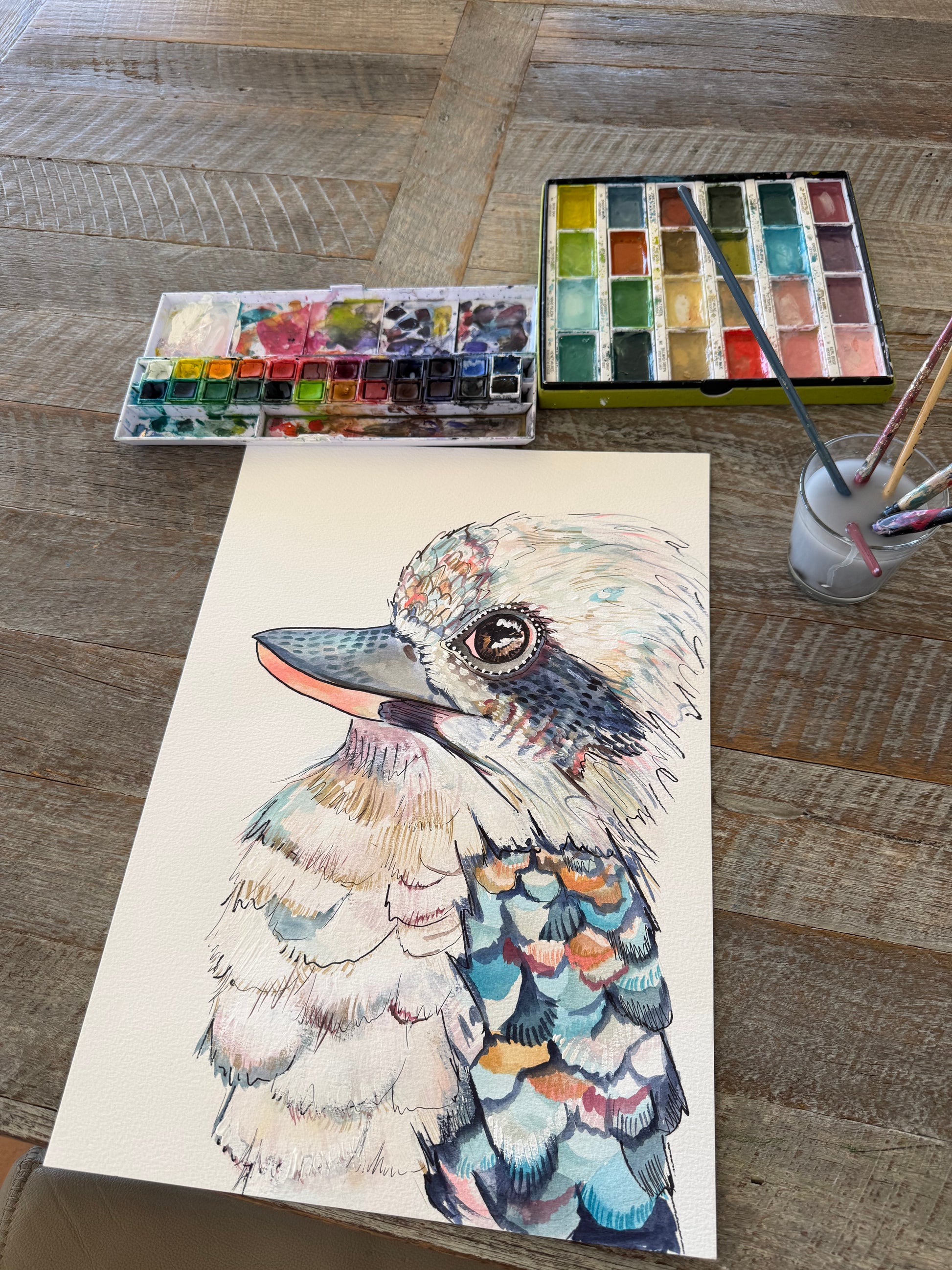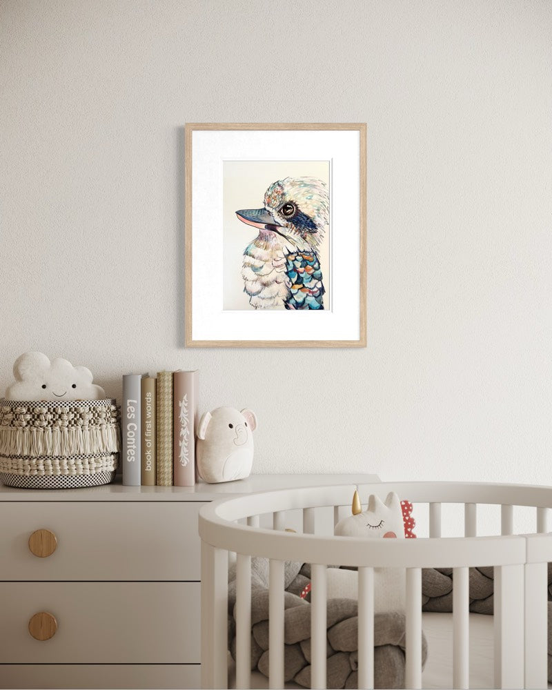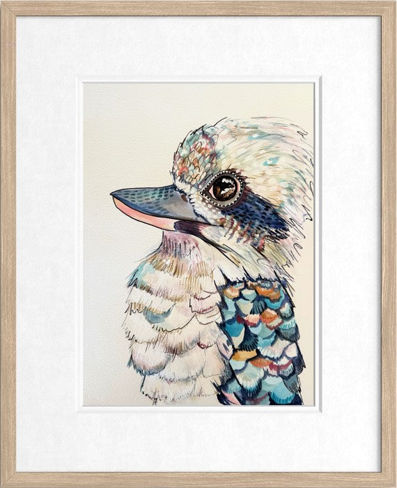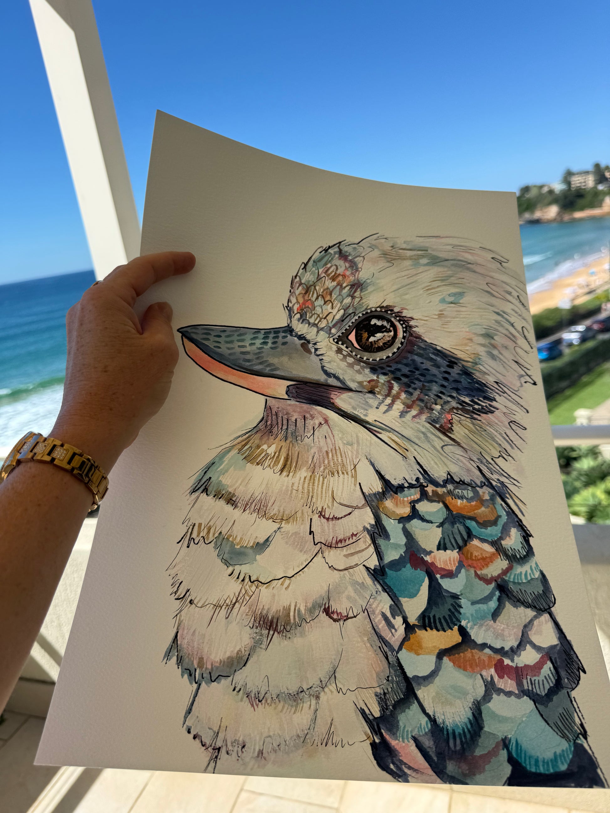 Perched proudly above the shoreline of Terrigal, ‘Koko the Kookaburra’ surveys the rolling coastline with a calm, knowing gaze. The ocean stretches endlessly behind, painted in soft, flowing washes of aqua and deep sea blue, melting gently into the sandy curves of the beach below.