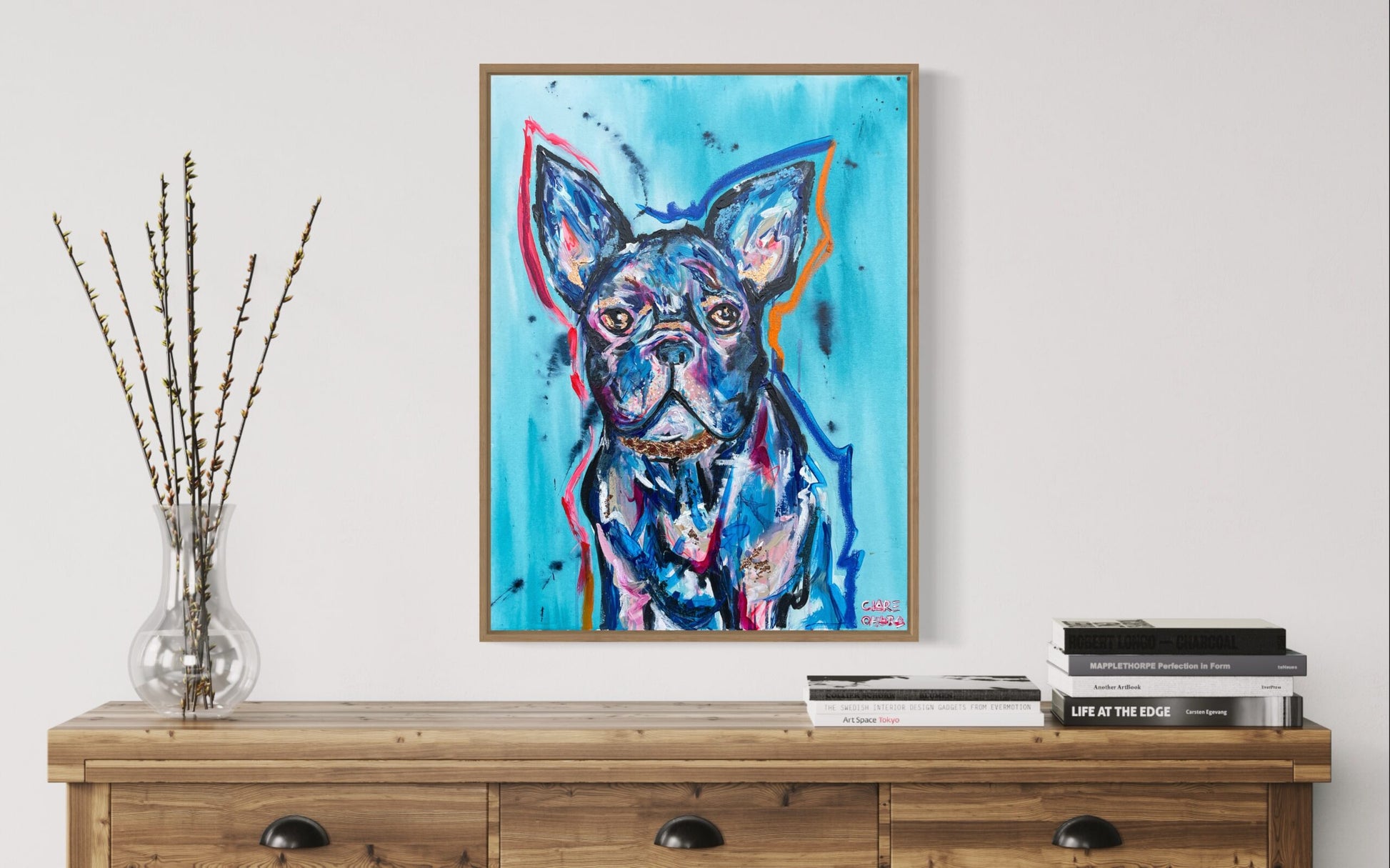 Lexi The Frenchie is a real cutie!! Inspired by my beloved French Bulldog, Lexi. The use of bold colors and playful elements give the artwork a cheerful and joyful vibe that captures the essence of my furry friend's personality. I wanted to express the happiness and lightheartedness that Lexi brings into my life through my artwork.