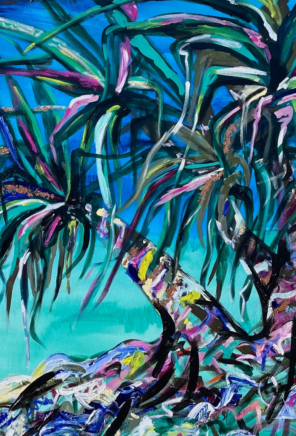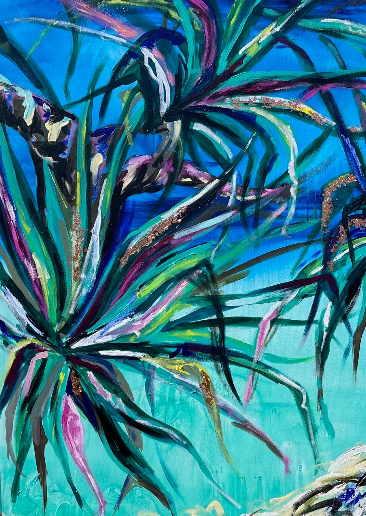 Pandanus Escape was a commission piece for a local Merewether client. The client liked my brightly coloured artwork style but wanted a custom piece of brightly painted Pandanus trees to remind her of her coastal holidays. This original artwork is proudly hanging in her new home.