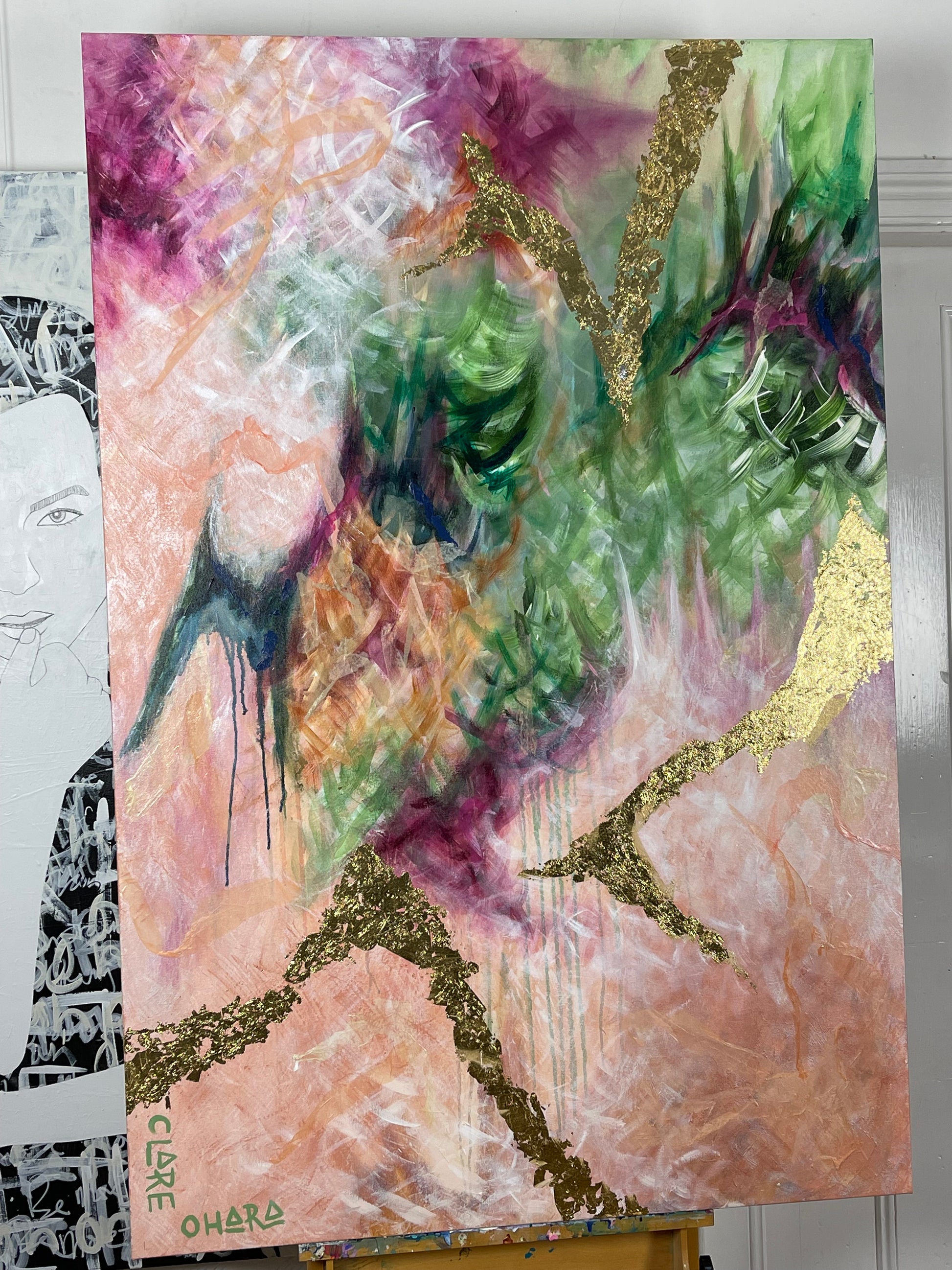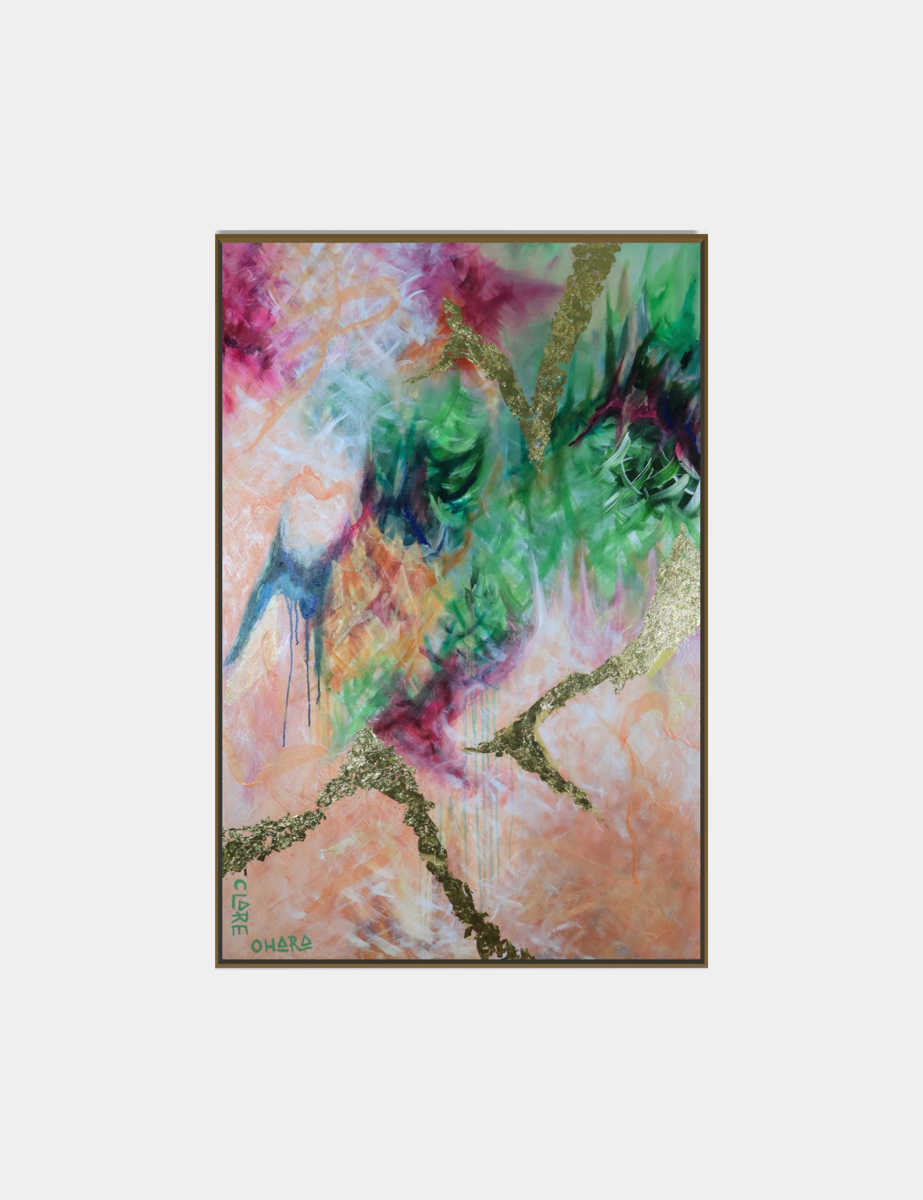 Painted on canvas with acrylic paint, impasto mediums with metallic accents. Glazed and shadowbox framed in natural oak wood.