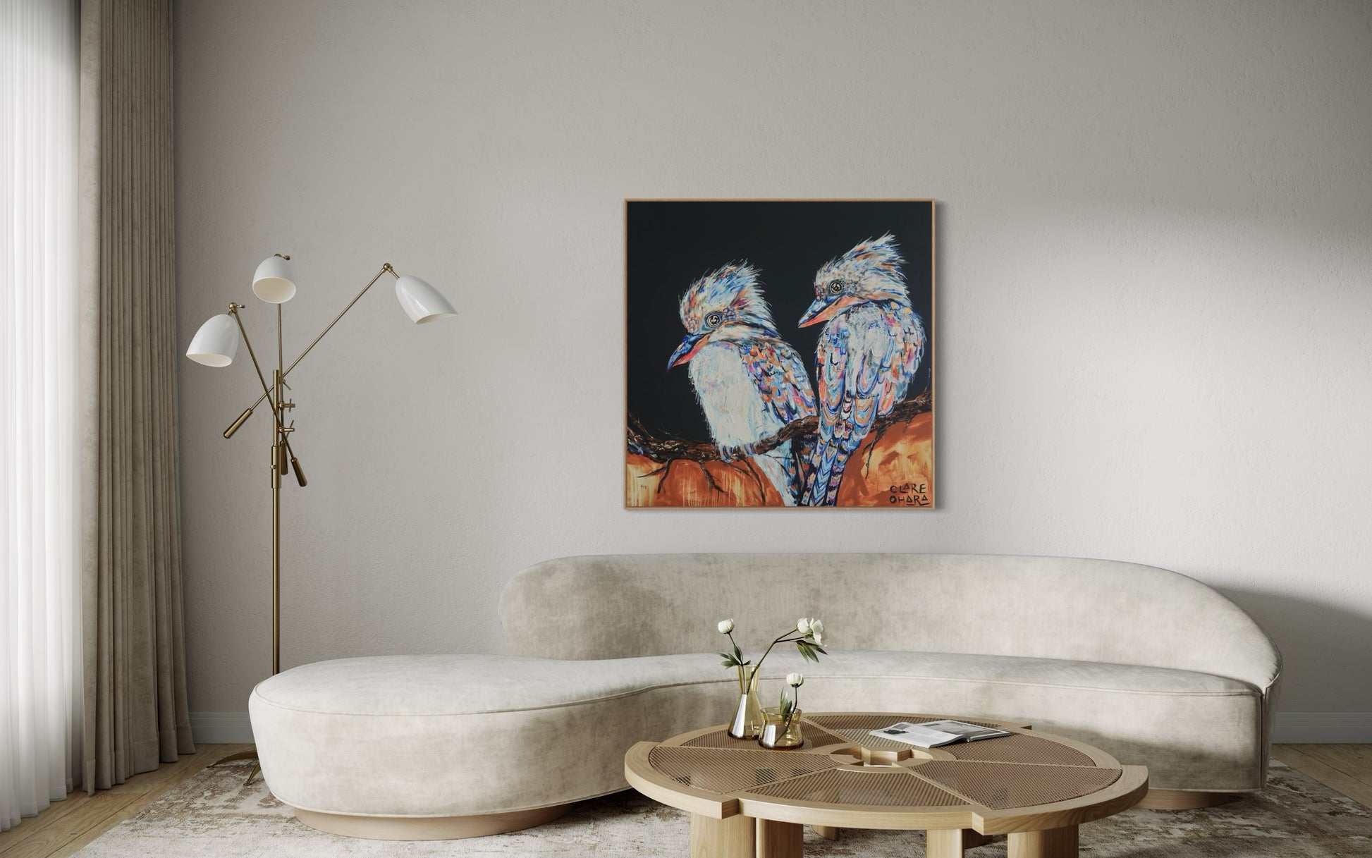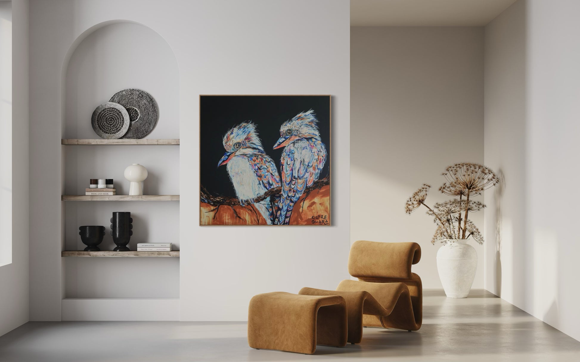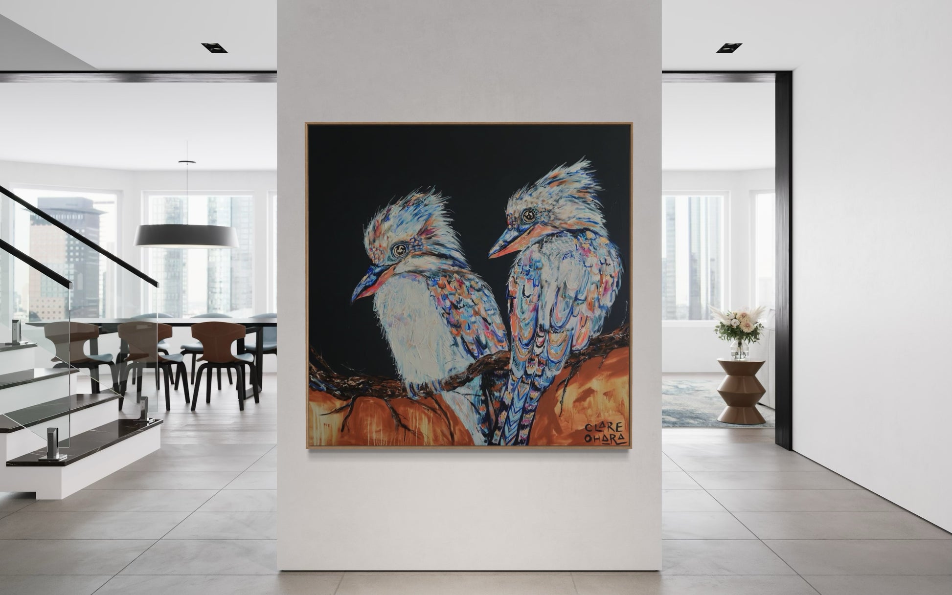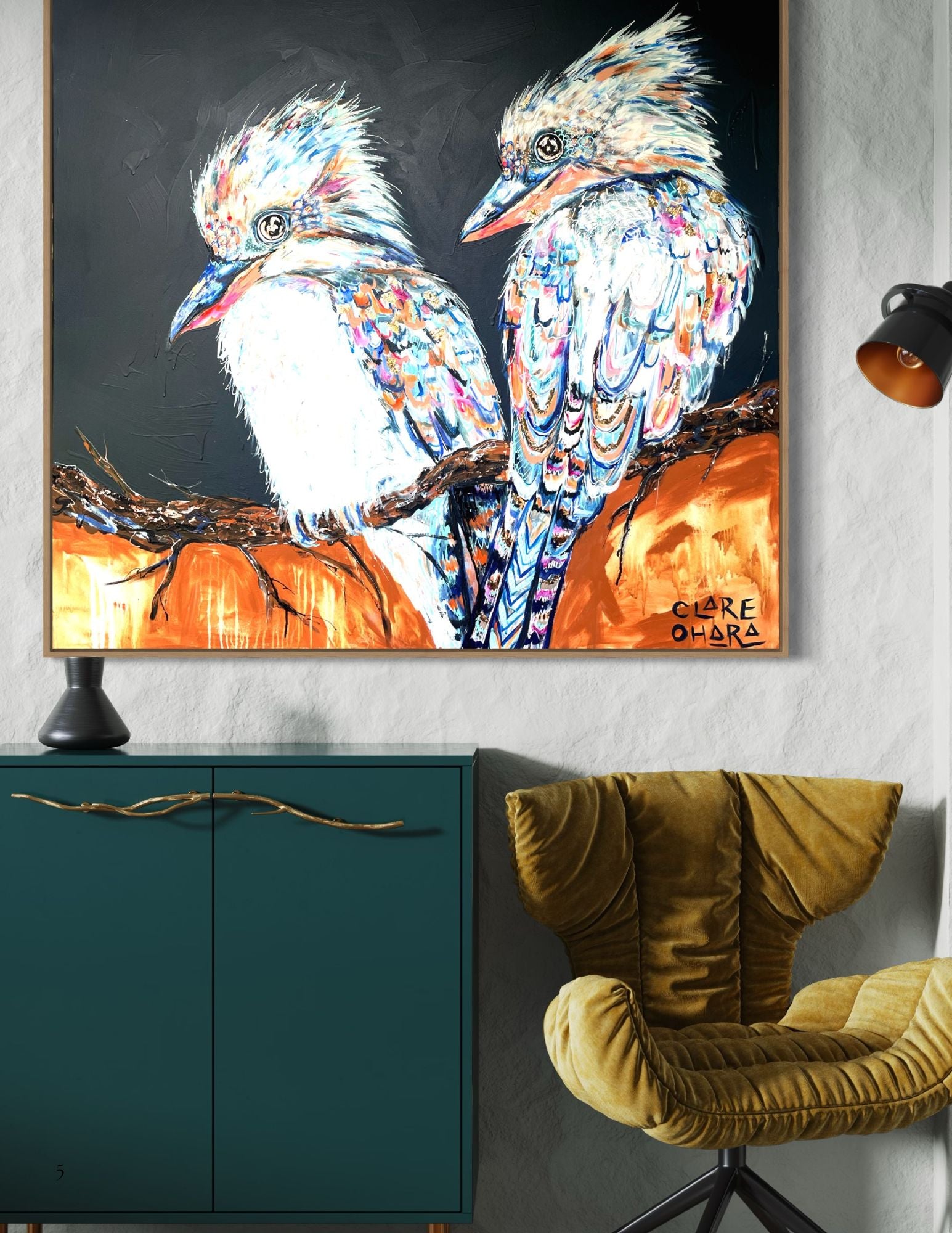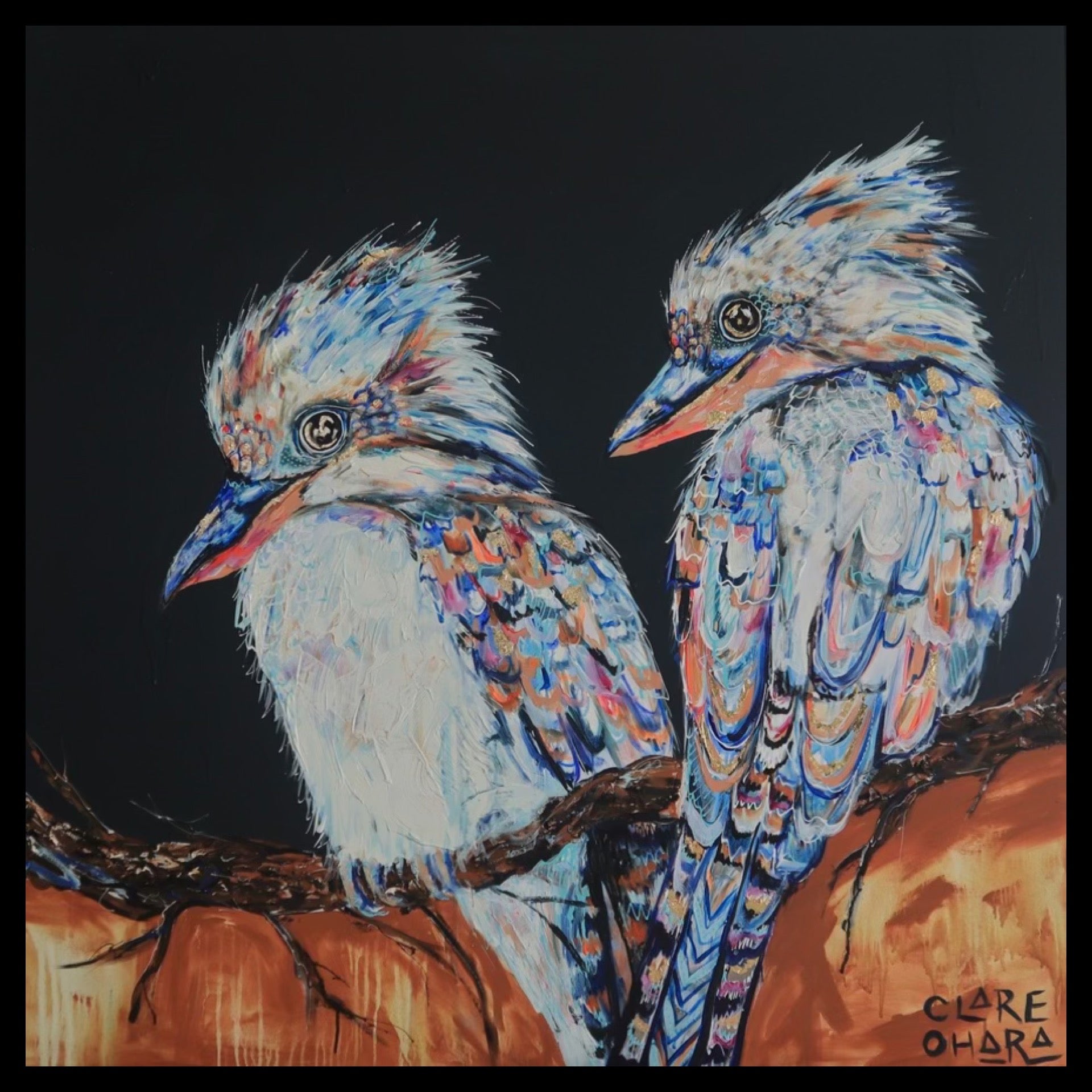 Layered brushstrokes echo the unpredictability of life: moments of calm broken by bursts of colour and movement. The backgrounds vibrate with energy, reflecting the noise and beauty of the natural world — and of our own inner landscapes. Each kookaburra holds its ground, chest forward, eyes bright, as if daring the world not to smile back. In their vivid plumage and expressive gaze, there is both playfulness and strength. They remind us that laughter is not trivial; it is powerful. It is a connection. It is legacy. It is light.